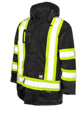 This hi-vis parka can handle the cold weather from any region of the Great White North. A perfect parka for those on a road crew or a construction site. The quick release hood can accommodate a hard hat.