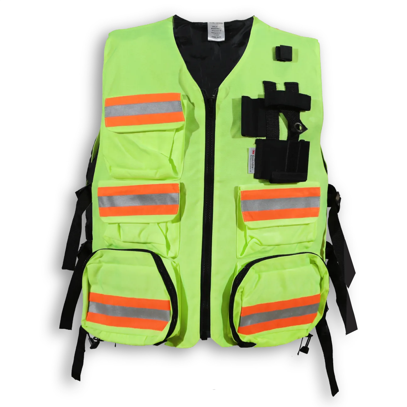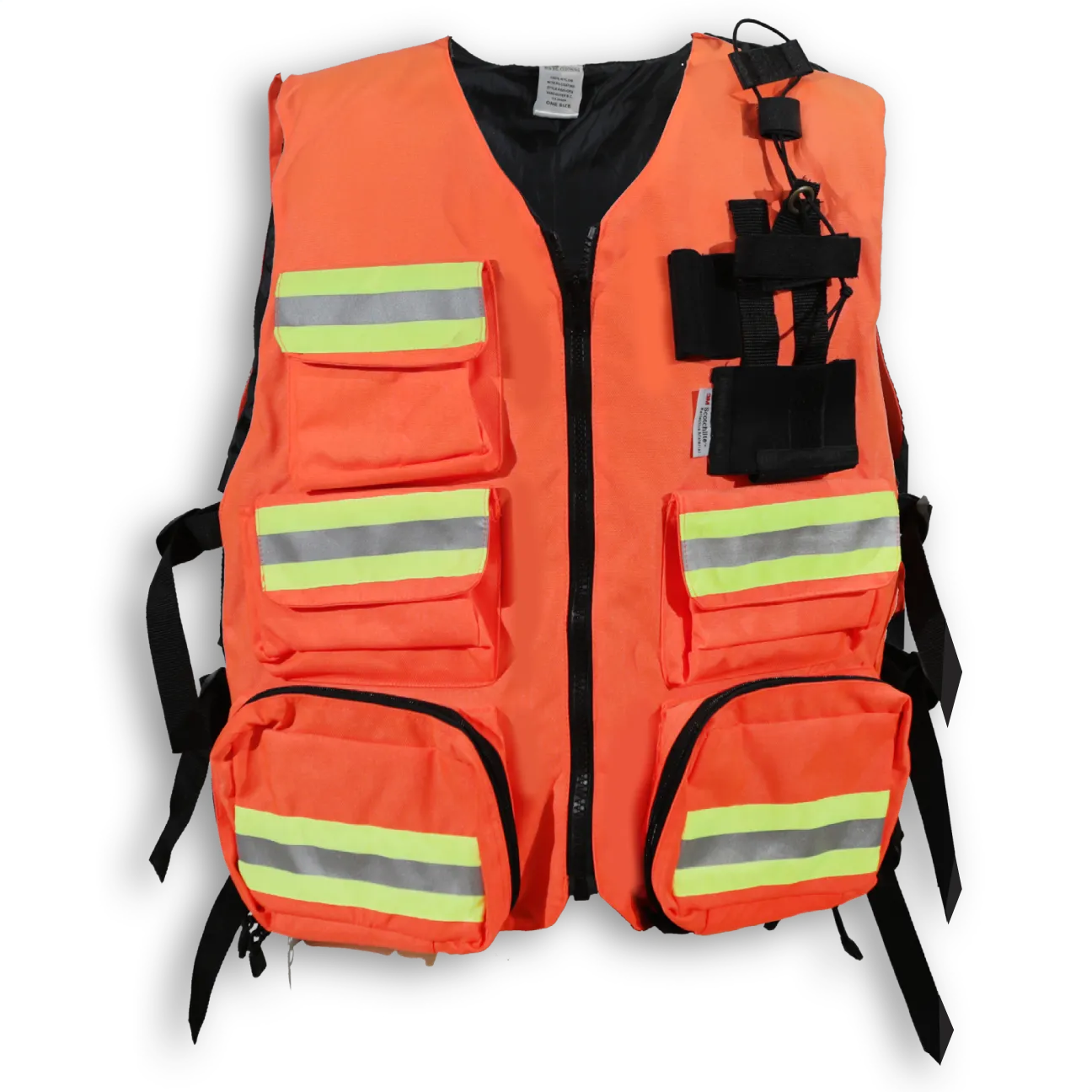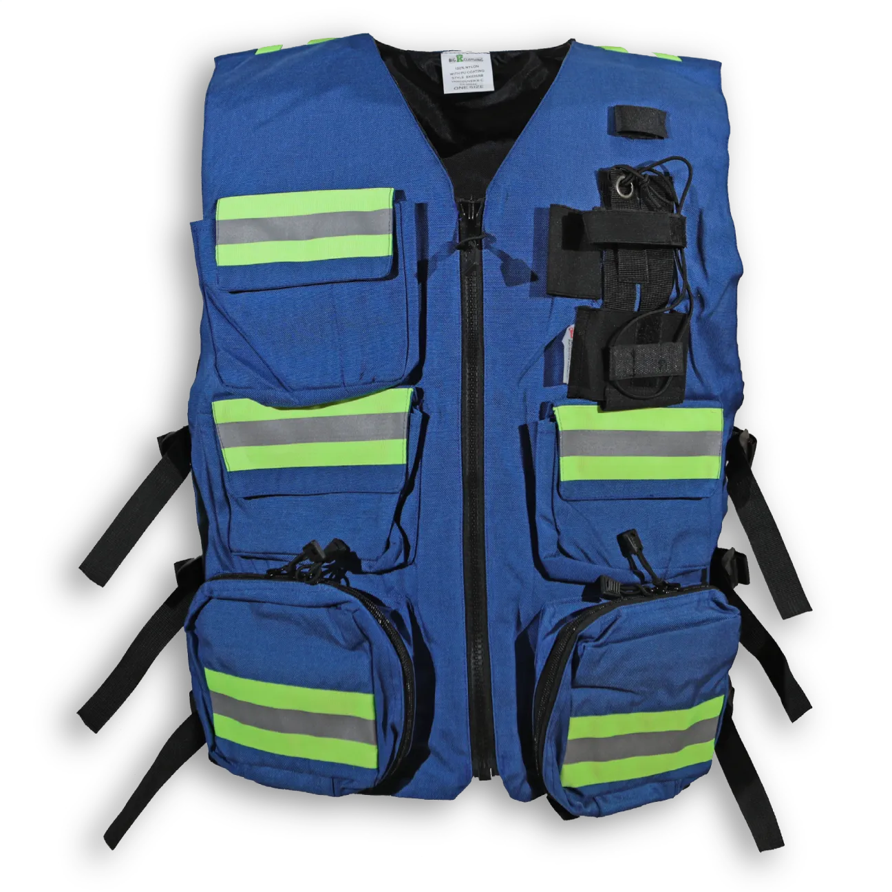 Made from 1000 Denier nylon, this first aid vest has 5 large front pockets, fully adjustable straps, a radio pocket, a flashlight holder and a back pocket with reflective tape that can be printed with title. It features a highly durable YKK zipper closure and 2 ¼” 3M reflective tape.