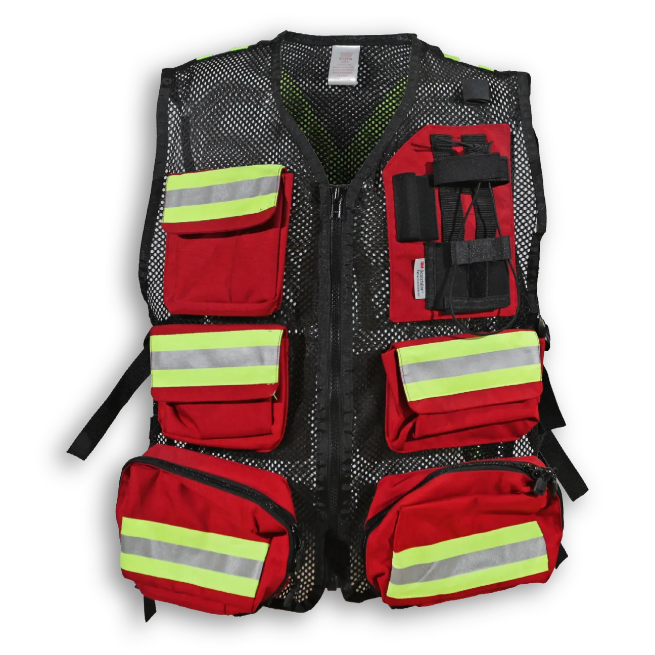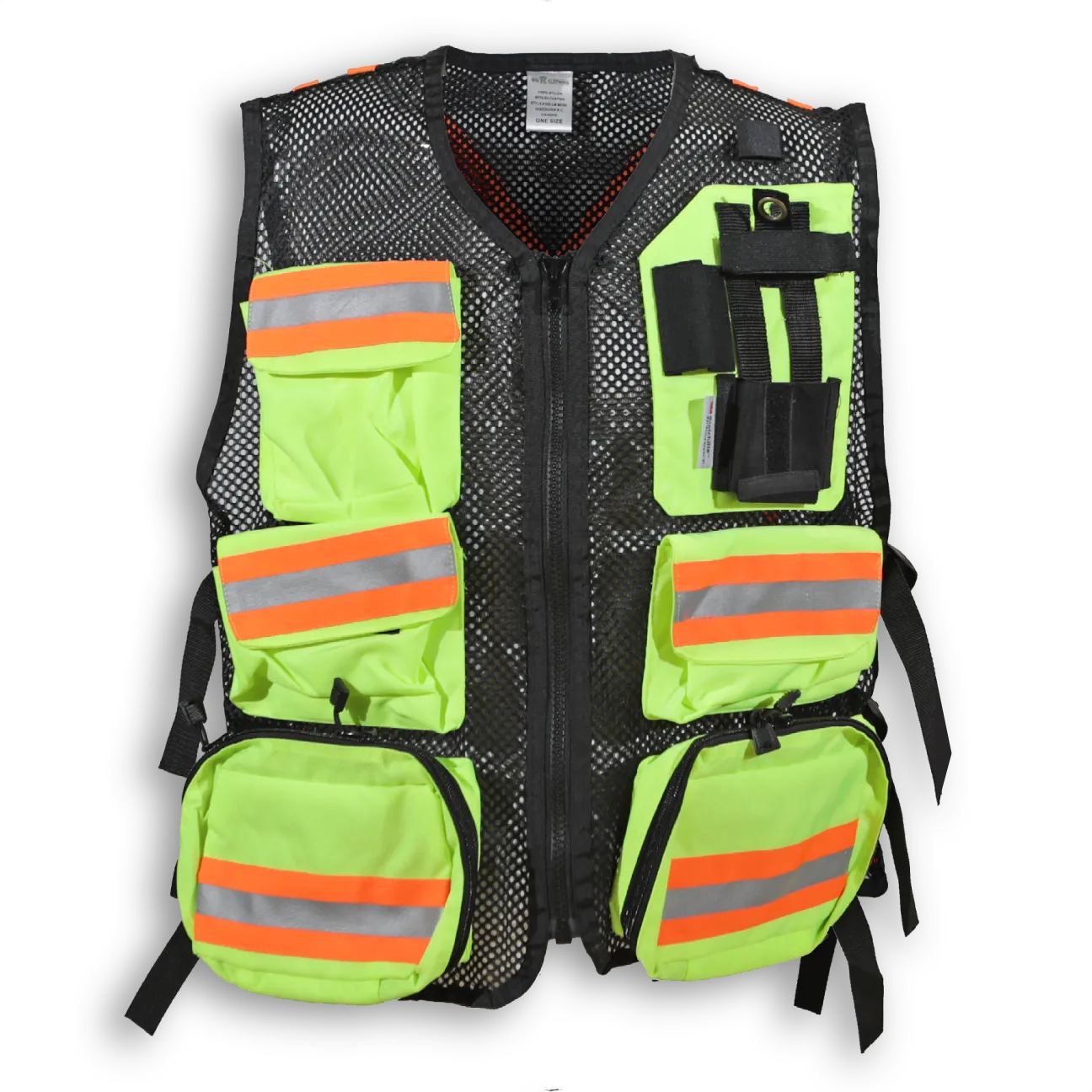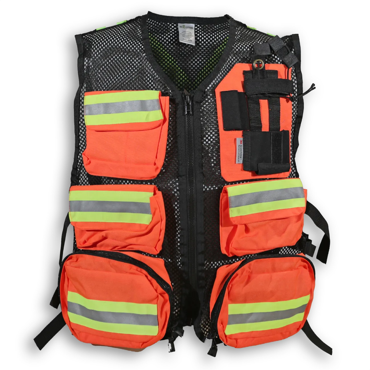 Made from 1000 Denier nylon, this first aid vest has 5 large front pockets, fully adjustable straps, a radio pocket, a flashlight holder and a back pocket with reflective tape that can be printed with title. It features a highly durable YKK zipper closure and 2 ¼” 3M reflective tape.