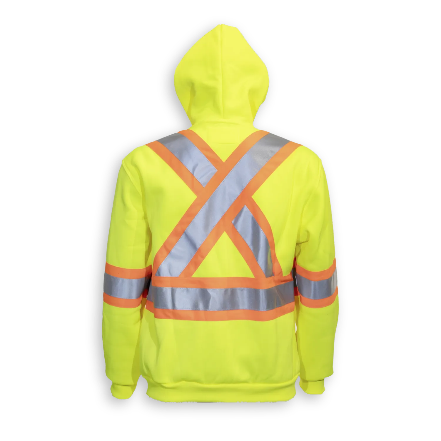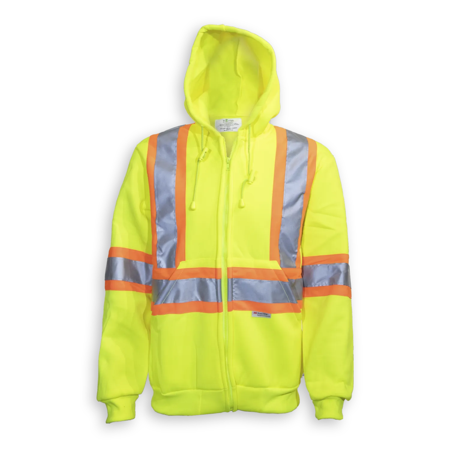 Our orange polyester hoodie has a full front zipper and hand pouch and 4” 3M reflective tape. It meets CSA Z96-22 Class 2, Level 2 standards