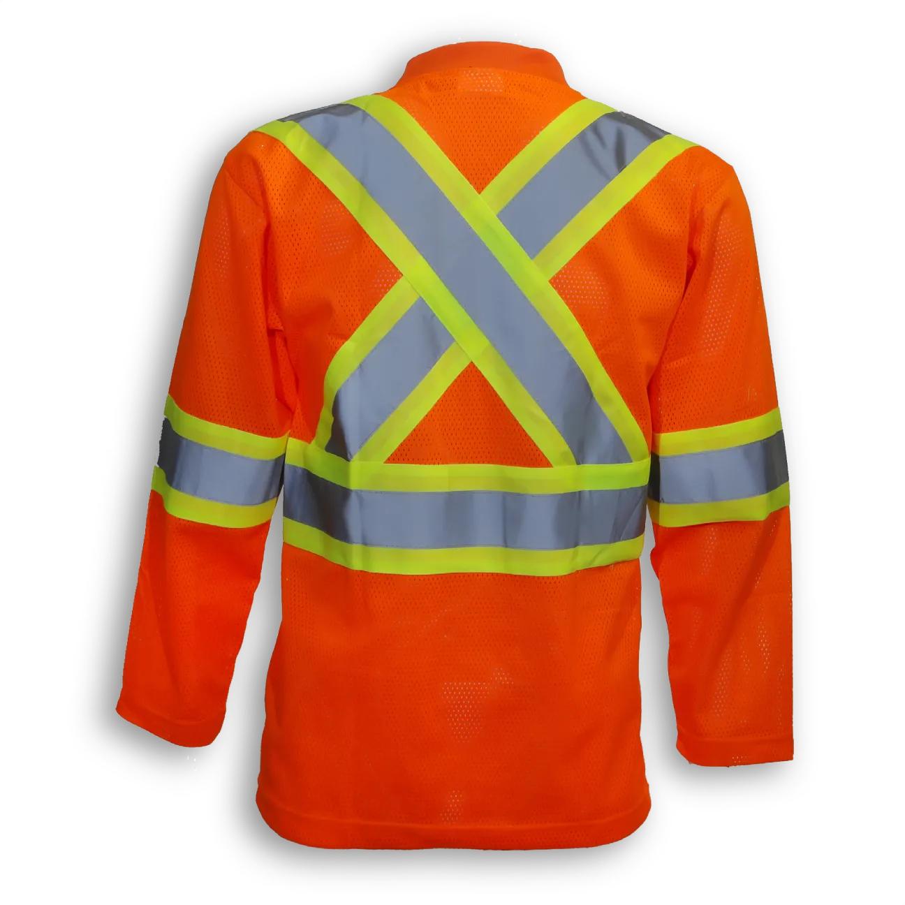 Soft mesh safety t-shirt with V-neck has breast pocket and 4" 3M reflective tape. Meets CSA Z96-22 Class 2, Level 2