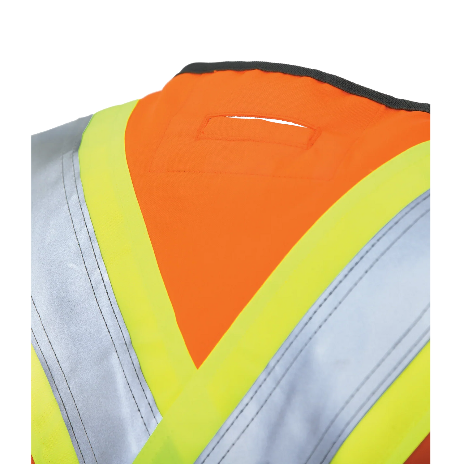 This vest offers a zipper front closure for easy wear, along with a multi-pocket design including 5 upper chest pockets (including a pencil pocket) and 2 lower patch pockets with flaps. Grommets for tape feed and hooks, mesh side vents for breathability, and a safety harness opening add functionality. Contrast binding enhances durability and style. Perfect for work environments requiring visibility and convenience, this vest ensures you're prepared and protected on the job.