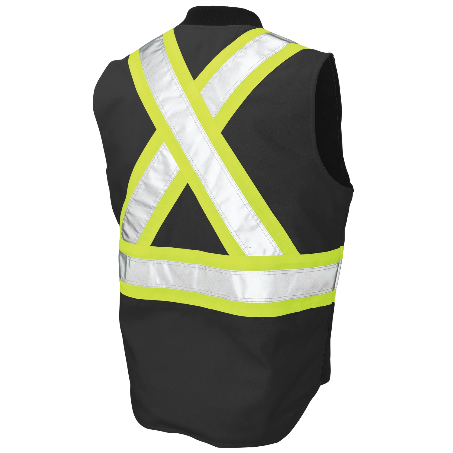 Designed to keep you warm and cozy in changing weather conditions. Crafted from 100% cotton 10 oz. premium duck with durable water-repellent finish and lined with 100% polyester quilted to 3 oz. polyester insulation, this vest offers superior warmth and protection. It features 3M™ Scotchlite™ 2″ Reflective Material with a 4″ contrast backing for enhanced visibility, along with a heavy-duty zipper front closure and practical pockets, including an upper chest welt pocket with a pencil pocket and 2 lower scoop pockets. The rib-knit collar and knit side inserts provide strength and freedom of movement, while the drop-back design adds extra coverage. Complete with an inside pocket for additional storage; this work vest combines comfort and durability for all-day wear.