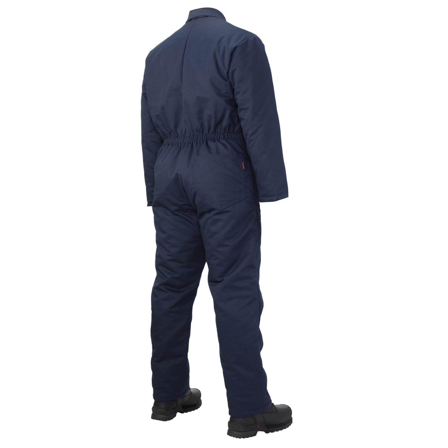Stay warm and covered up with our insulated twill coverall. Comfort features include a laydown collar, a back elastic waist and a generous cut that enables unrestricted freedom of movement. It features a two-way covered brass zipper for convenience, durability and warmth. Multiple pockets help you keep track of parts and tools while the side pass through pockets give you quick access to keys, phone or other personal effects without having to unzip.